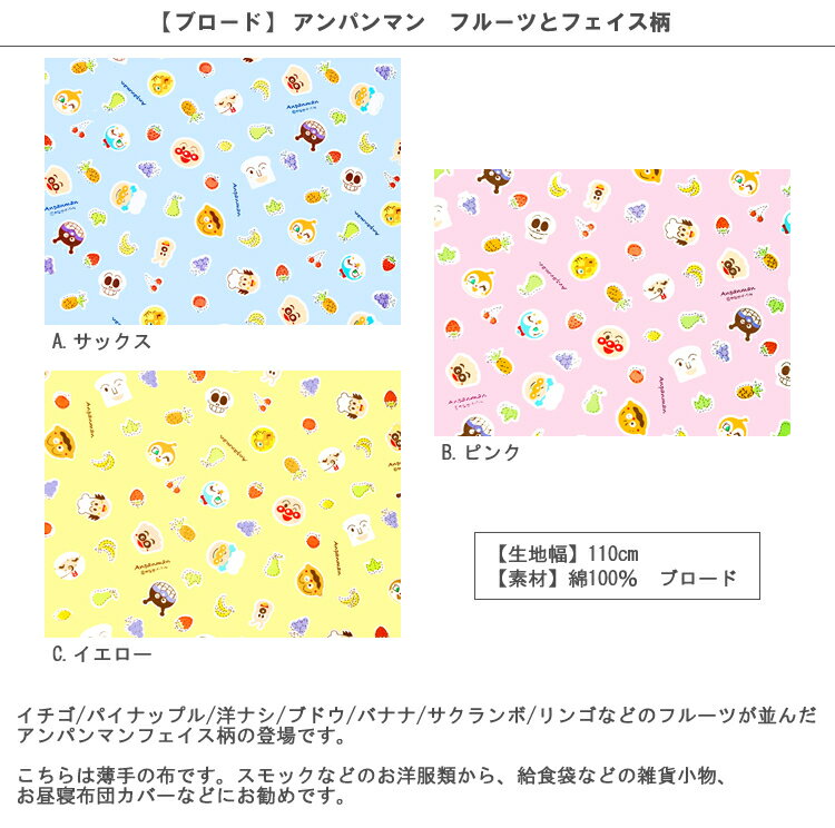 【ブロード】★10cm単位続けてカット★アンパンマンフルーツとフェイス柄2019SS【あんぱんまん バイキンマン ドキンちゃん コキンちゃん 食パンマン カレーパンマン メロンパンナちゃん 薄手 入園 通園 入学 通学 生地 布】 商品価格:154円 レビュー件数:2件 レビュー平均:5(5点満点) 楽天で購入 トップページへ
