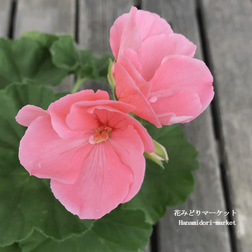 花はサーモンオレンジの柔らかな印象の可愛い色合いでアイビーゼラニュームのような光沢のある葉とのコントラストが魅力です。